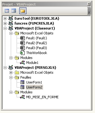 L'explorateur de projets permet de visualiser tous les emplacements dans un classeur ouvert ou les macros personnelles pouvant contenir du code VBA. C'est aussi à cet endroit que l'on peut voir les formulaires créés.